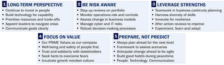 At GIC, we continue to emphasise the importance of our five investing principles and PRIME values, as well as deepen our purpose as an organization, and at the people level. Our five investment principles guide our efforts to strengthen organizational resilience: