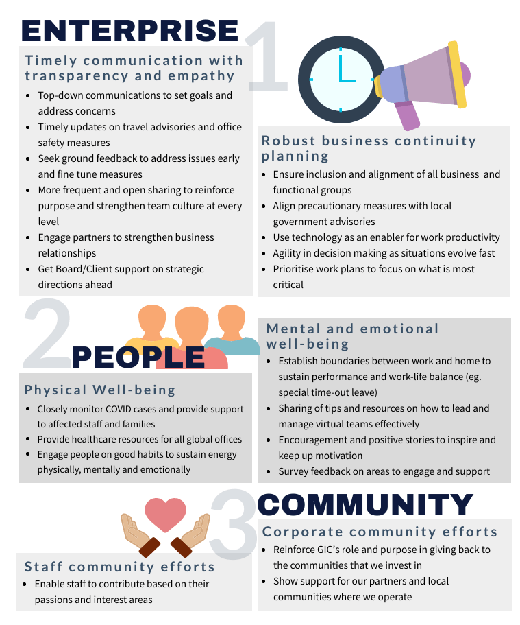 Given GIC’s purpose and long investment horizon, the resilience of our people, processes and systems are necessary for us to navigate and cushion the impact of such events on our global operations, portfolio and business. After COVID-19, there will undoubtedly be additions to our future playbooks. What will remain constant is our focus on our mandate, as well as our commitment to GIC’s values and the well-being of our people.
