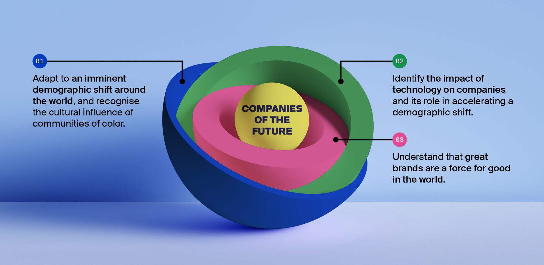 First, the demographic shift in this country, and the global cultural influence of Black people – singularly the most important theme of my lifetime, which is not being given its due.  Second, technology which impacts not just companies, but is also promulgating a quicker demographic shift. Lastly, great brands are a force for good in the world. Companies of the future will be the ones that sit at the center of these three concentric circles.