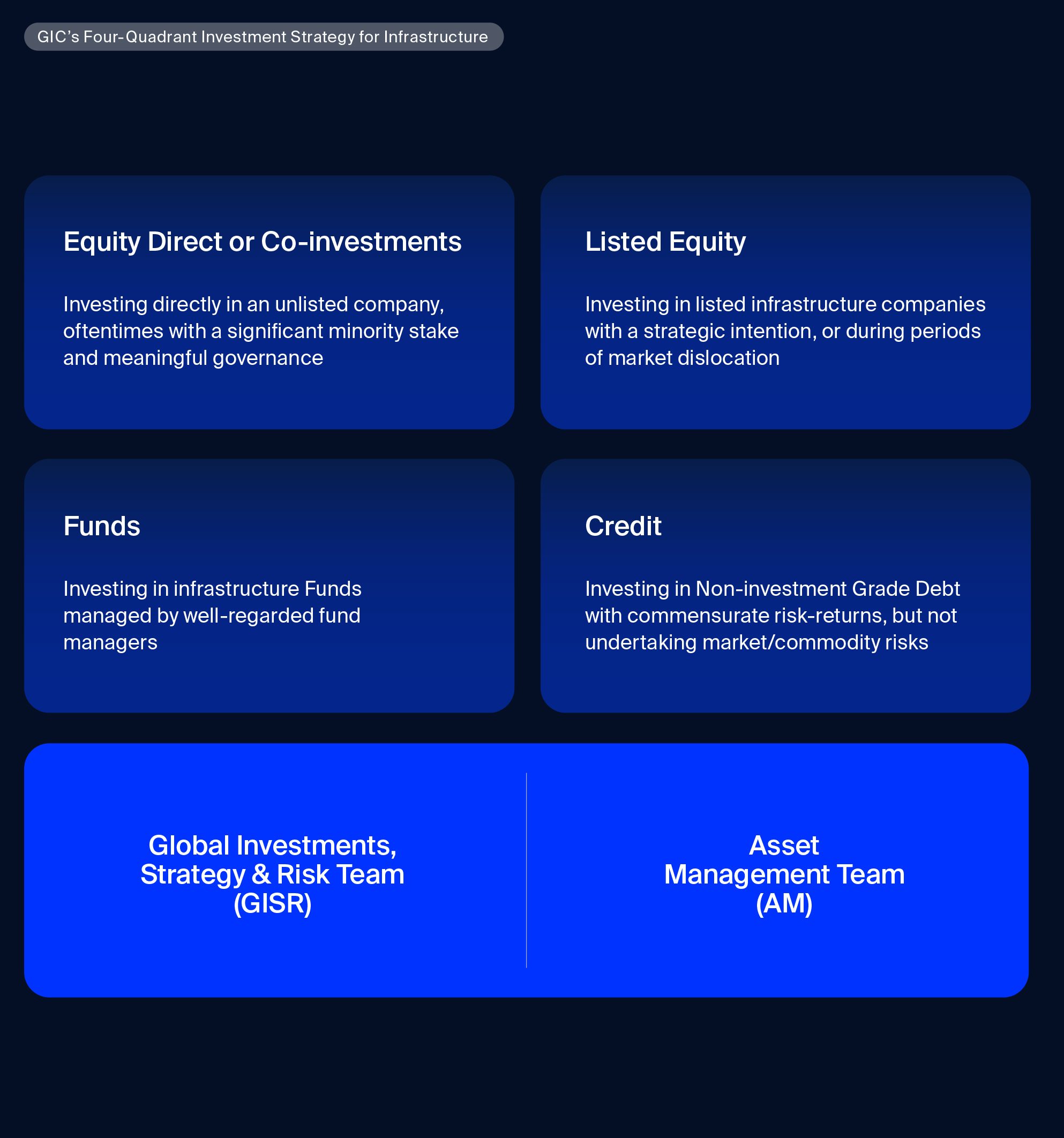 Underpinning GIC’s infrastructure approach is a Four-Quadrant investment strategy that allows the team to invest across multiple parts of the capital structure via different investment structures. The strategy comprises primarily direct investments in private or listed infrastructure businesses, either through equity or non-investment grade infrastructure credit. Select investments with well-regarded fund managers complement the direct investment portfolio.