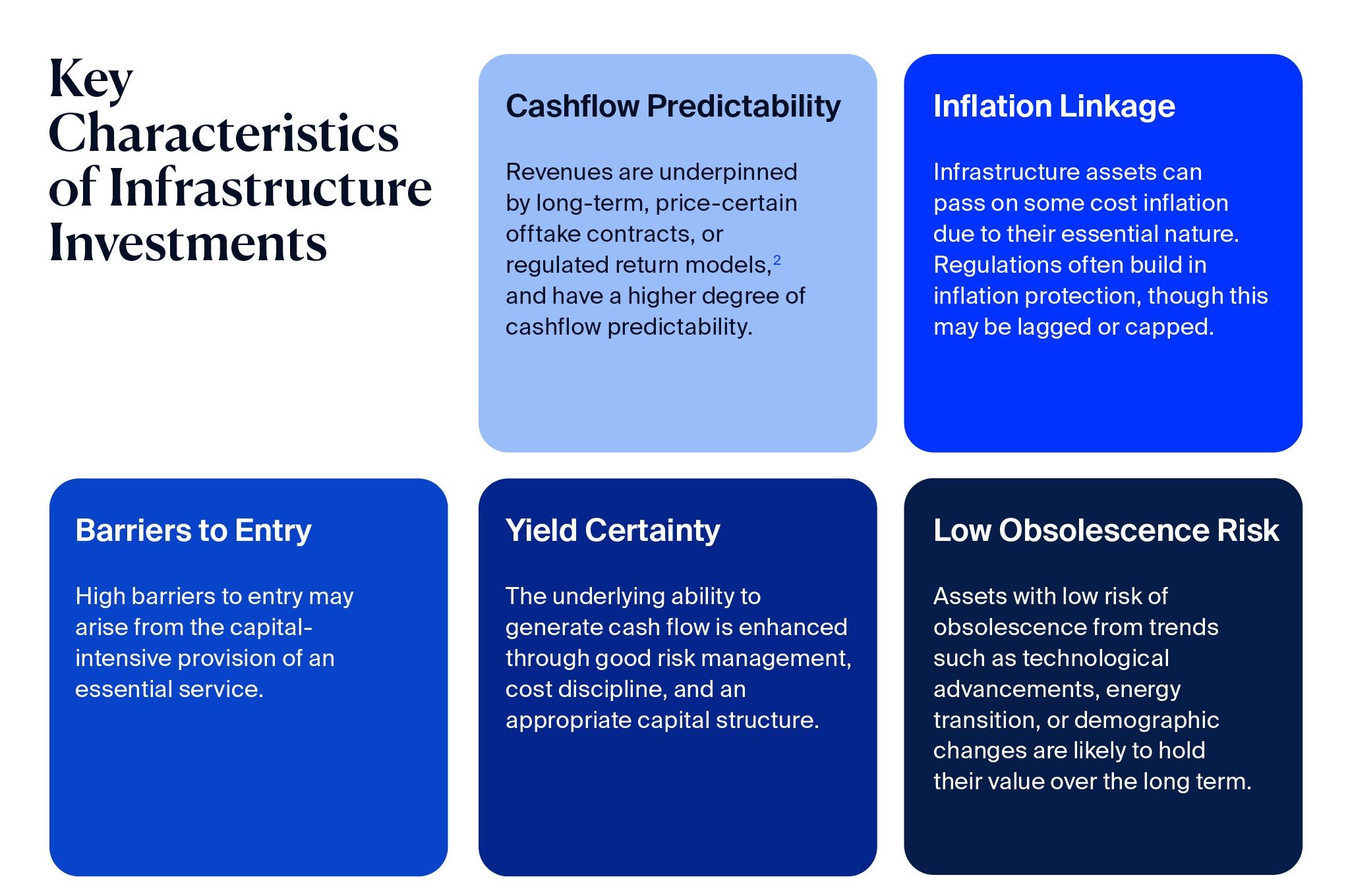 Each infrastructure investment is assessed for five key characteristics that speak to the qualities of its business and underpins its investment thesis.