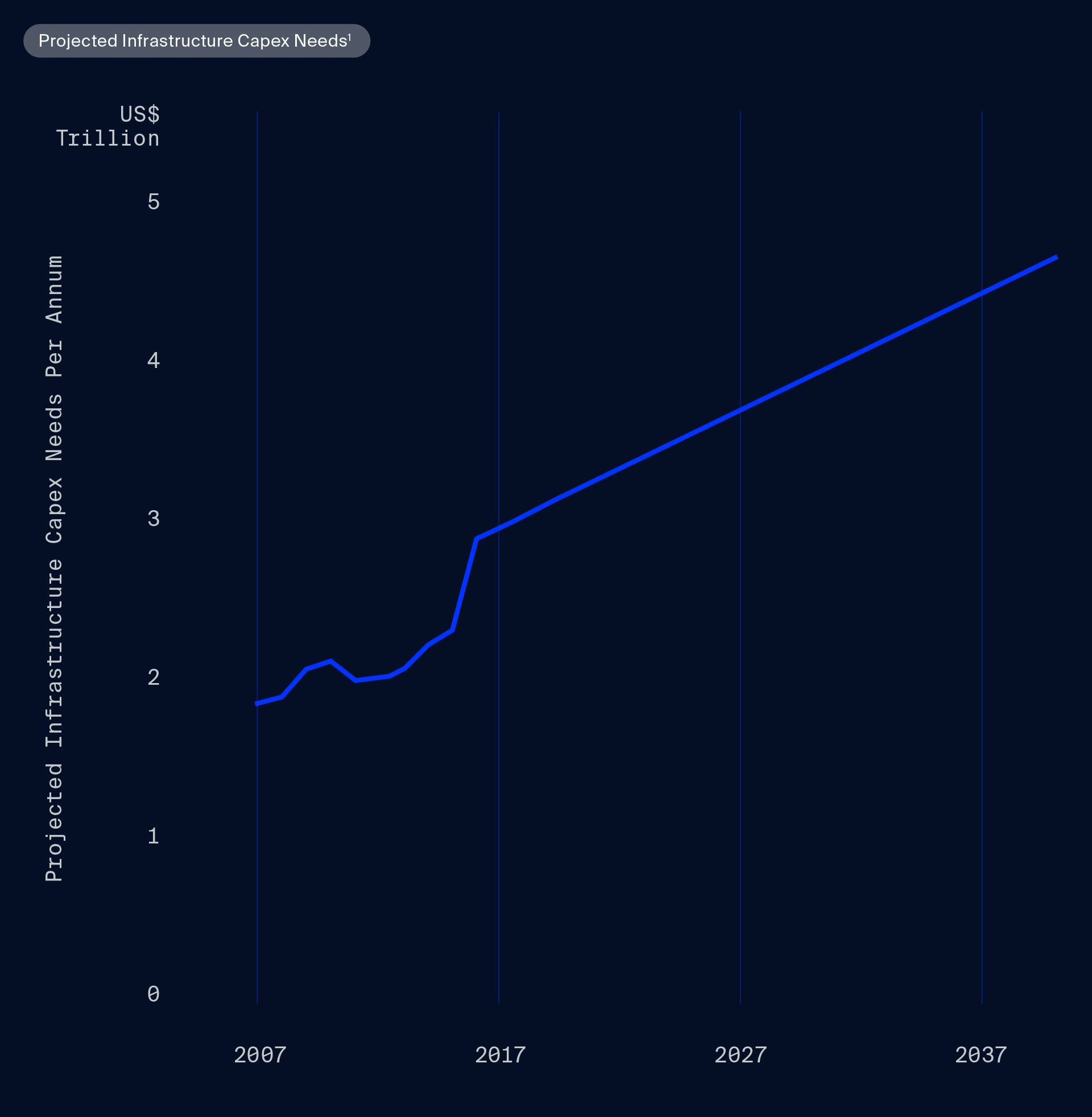 Global infrastructure investment needs are expected to total US$94tn between 2017 to 2040. This implies an average of US$3.9tn per annum.1