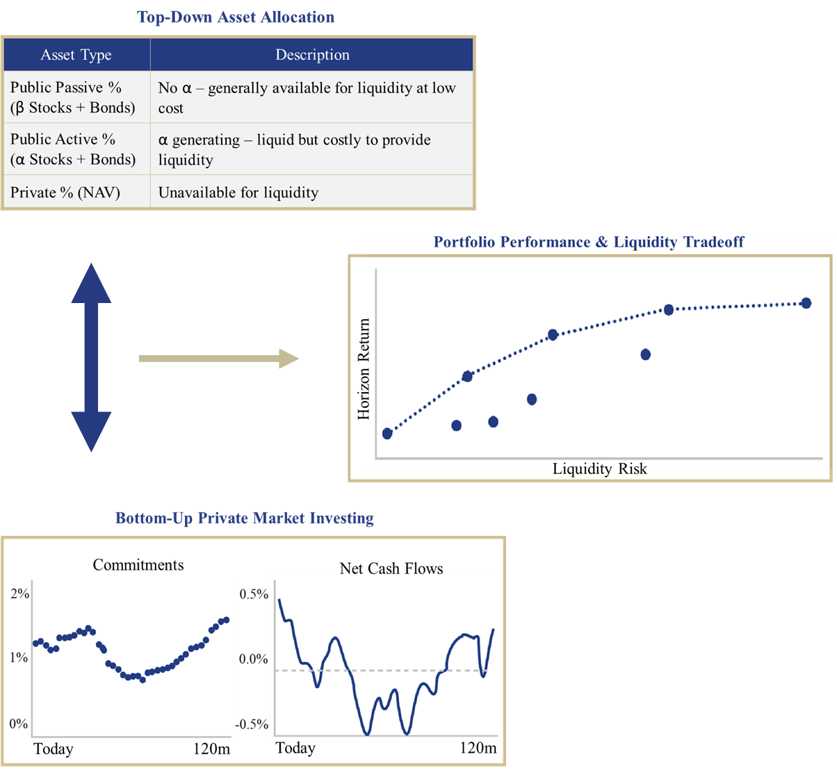 Investors can use this framework to analyze how allocations to illiquid private assets (a top-down decision), in combination with their private asset commitment strategy (a bottom-up decision), affect their portfolio’s ability to respond to liquidity demands (Figure 1).