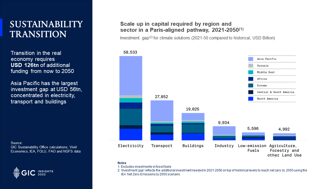 • The role of climate finance was front and centre at COP27. Based on the IEA’s “Net Zero Emissions by 2050” scenario, transition in the real economy will require an additional US$126 trillion from now until 2050, and almost half of this money is needed in Asia-Pacific.