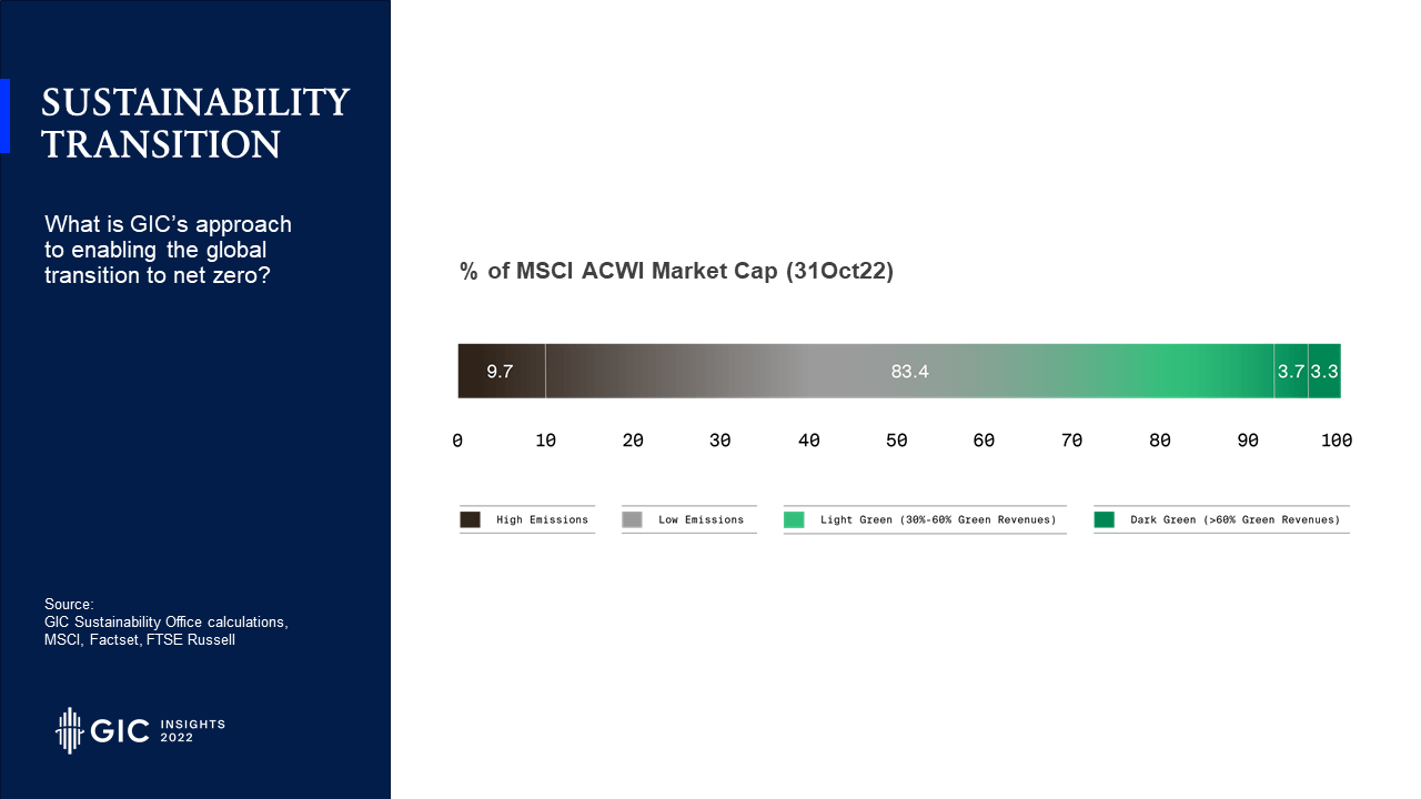 • At the other end of the spectrum are green assets deriving a high percentage of their revenues from green activities such as renewable energy and other decarbonisation solutions. GIC has been quite active in investing in this area, but as you can see from the Index proxy, these assets only make up a small part of the investment universe. We need to help to grow this. GIC would like to play a role in developing the ecosystem, including the off-take market and creating customer demand for climate solutions such as green hydrogen.