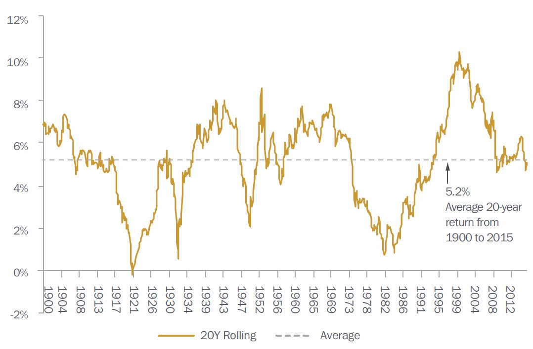 Figure 1: 20-Year rolling real return of a US 65% stocks/35% bonds portfolio from 1900 to 2015