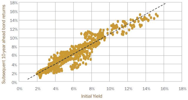 Figure 4: 10-year US bond returns vs initial yields (1900 – 2016)