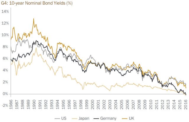 Interest rates are unlikely to go much lower than their current low levels (see Figure 6, below). As at end June 2016, about 30% of global bond markets, or approximately US$13 trillion of bonds, were offered with negative nominal yields. This means investors must in effect pay interest to invest in these fixed income instruments rather than receive interest for doing so.