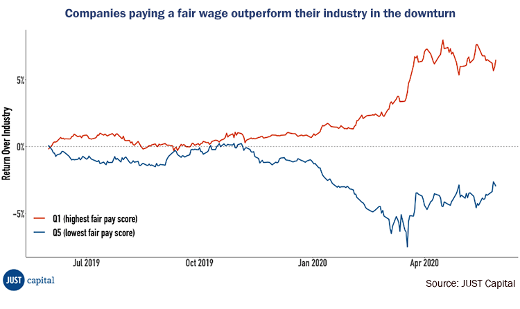 While the Environmental aspect, particularly climate change remains a key focal point, COVID-19 has resulted in Social factors having a greater influence on corporate behaviour, economics and financial performance. For example, as the figure below illustrates, companies that pay fair wages to their employees saw their share prices clearly outperform, as compared to that of companies that ranked poorly on fair pay – thus giving new impetus to “stakeholder capitalism” despite current pressures on companies’ profits and investor returns.