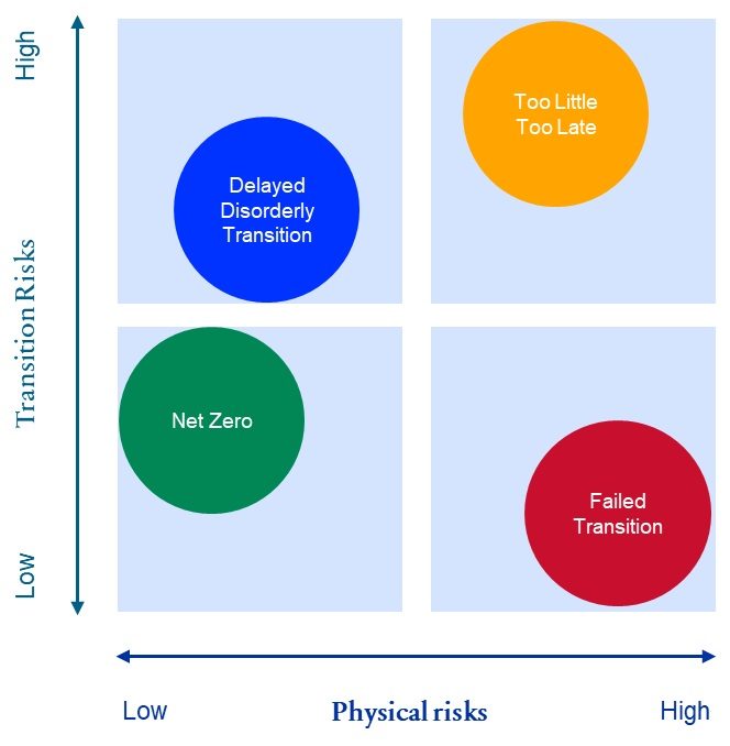 Figure 1: Physical vs transition risk impacts in GIC’s climate scenario set