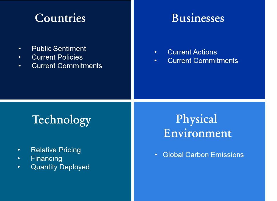 The GCS uses a range of indicators covering four dimensions: countries, businesses, technology, and the physical environment. They include indicators of the future and present, of words and deeds, and across key stakeholders and drivers of decarbonisation. Figure 2 provides an overview of the indicators used in the climate signposts. See Appendix A for more details on the methodology.