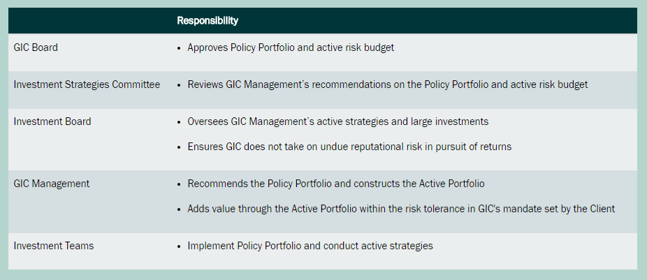 The Government is not involved in GIC’s investment decisions. The Board assumes ultimate responsibility for asset allocation and the performance of the portfolio. Management executes investment strategies and is responsible for all investment transactions.